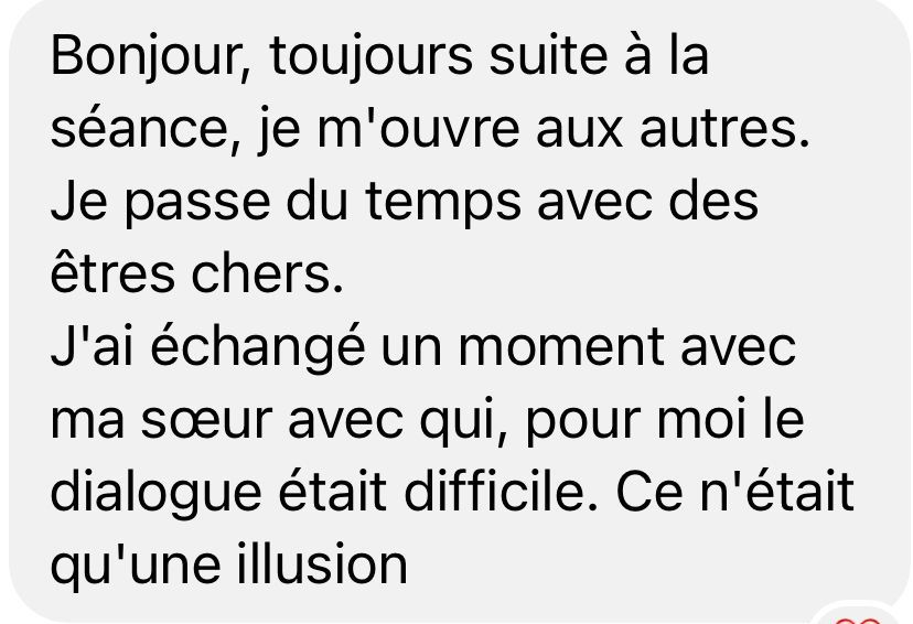 Vous ressentez de nouveau cette joie de vivre en vous, vous vous sentez libre de vos mouvements, de votre vie. Vous vous êtes allégés des problèmes qui gangrenaient votre vie. Vous reprenez confiance en vous, vous êtes au centre de votre vie.